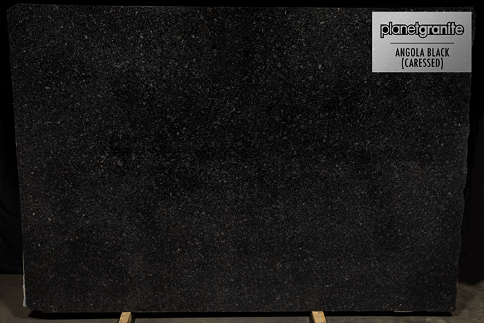 Angola Black Granite boasts a deep, jet-black base layered with a complex array of dark charcoal and graphite gray mineral specks that shimmer subtly across the surface. Interspersed throughout are hints of silver and steel blue flecks, adding dimension and a cool metallic sheen that catches the light from different angles.