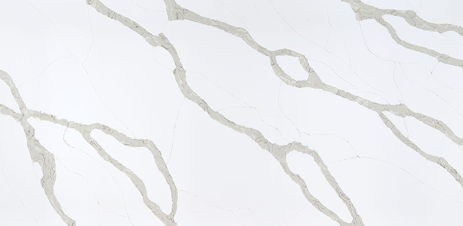 With sweeping veins across a white base, this quartz makes a bold and captivating impression with a dynamic sense of movement. A polished finish enhances the surface with a smooth, reflective sheen. Ideal for statement countertops, waterfall islands, and striking full-length backsplashes where a touch of luxury is desired.