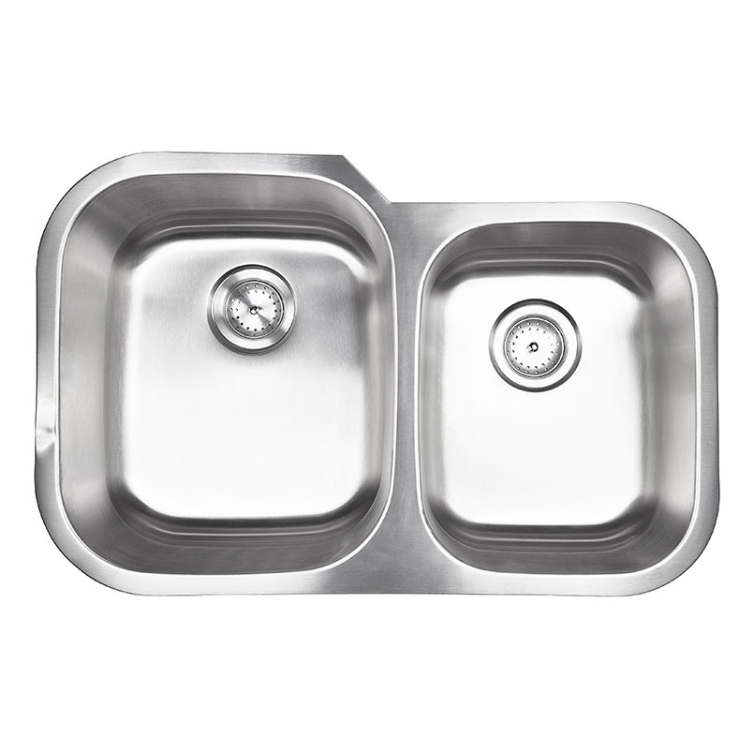 This classic double bowl undermount sink is constructed with 18-gauge thickness stainless steel for reliable durability. With one large and one smaller basin (60/40)—and sound shielding pads—it’s not only elegant but practical too. An ideal choice for busy homes and light commercial environments, this easy to clean sink offers a beautiful brushed satin finish that helps minimize small scratches for enduring beauty. Long lasting quality and elegance come together in this popular double bowl stainless steel sink designed to complement a wide range of kitchen styles. Strainer included and stainless-steel grid available.