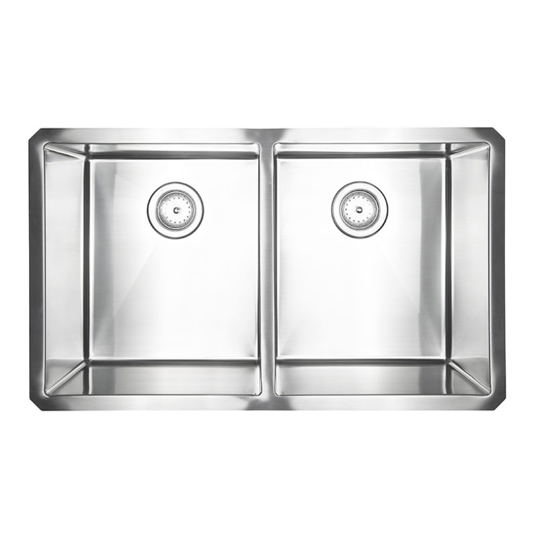 This hardworking handcrafted double bowl undermount sink is constructed with strong 16-gauge stainless steel for reliable durability. With two equally sized deep basins (10” each), this sink is there for you when you need it. Big family dinners? No problem. It can handle oversized cookware like stockpots, slow cookers, and baking sheets. An ideal choice for busy homes and light commercial environments, this easy to clean sink offers sound shielding pads as well as a beautiful brushed satin finish that helps minimize water spots and small scratches. Long lasting quality and elegance come together in this popular double bowl stainless steel sink.